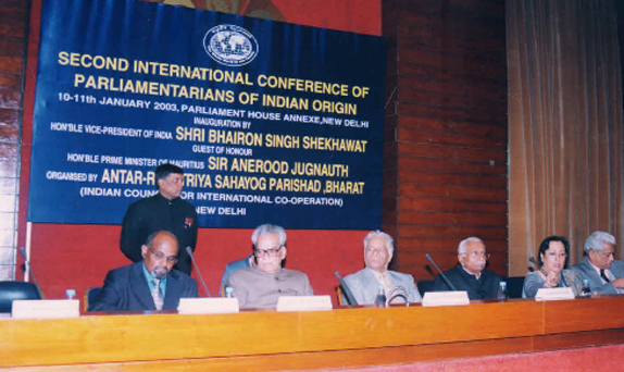 The Second PIO Parliamentarians Conference was organized by the ARSP on the 10th & 11th January 2003. This conference was inaugurated by the Vice President of India Shri Bhairon Singh Shekhawat on Friday 10th January 2003 in the Parliament House Annexe. Sir Aneroodh Jugnauth, then Prime Minister of Mauritius was the Chief Guest. 59 Parliamentarians from different countries participated in this programme. Prominent among the foreign Parliamentarians were Shri Mahendra Choudhry, former Prime Minister of Fiji, Dato Seri S.Samy Vellu, Minister from Malaysia, Shri George Shiuraj, Minister from Fiji and Mr. Premnath Ramnah, Speaker from Mauritius. Dr. Mrs. Linda Baoolal, Chairperson of Trinidad & Tobago Senate. Prominent participants from India were Mrs.Sushma Swaraj, the then I & B Minister, Shri Digvijay Singh , State Minister for External Affairs, Mrs. Najma Heptullah, Deputy Chairperson of Rajya Sabha, Shri Ved Prakash Goel, former Minister for Shipping and others.